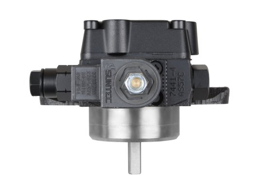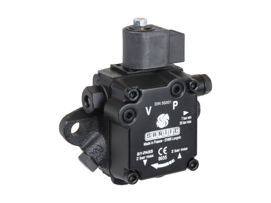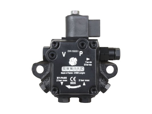 Жидкотопливный шестерёнчатый насос AS 57 C 7441 4P 0500 с производительностью 56 л/ч предназначен для перекачки горючего из топливного бака к форсункам горелки под давлением от 7 до 14 бар. Элементами управления служат золотниковый (регулировочный) и электромагнитный (отсечной) клапаны. Выход на подачу у данной модели располагается с левой стороны корпуса. Вращение вала, приводимого в движение внешним электродвигателем, осуществляется против часовой стрелки.