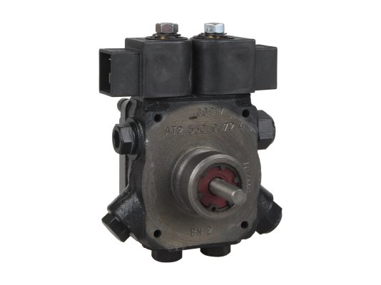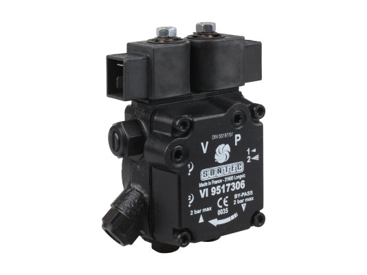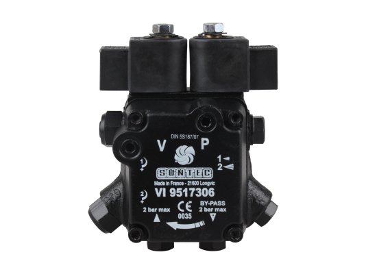 Надёжным комплектующим для маломощной дизельной горелки стал жидкотопливный насос шестерёнчатого типа AT2 55 C 9572 4P 0500 от французского концерна SUNTEC. Модель с производительностью 62 л/ч принадлежит к линейке насосов AT2 с двумя режимами подачи дизтоплива на одну форсуночную линию. В корпусе закреплены два электромагнитных вентиля, меняющие направление движения рабочей жидкости в зависимости от выбранного оператором режима.